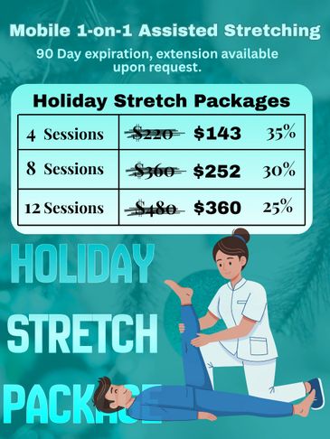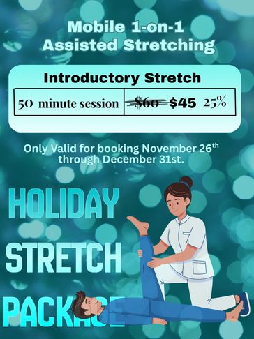 Give your body the gift of recovery this season. Enjoy a discounted introductory 1-on-1 assisted stretch session to reset, unwind, and move into the new year feeling your best. Limited-time holiday pricing available now through December 31st—book your session and treat yourself (or someone you love) to the ultimate restorative experience.
